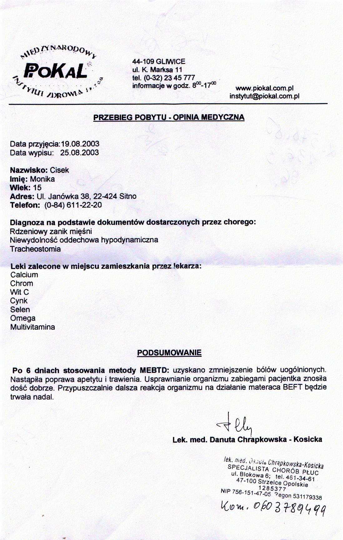 Dokumentacja Medyczna W tym dziale możecie Państwo zapoznać się z dokumentacją medyczną Moniki. Dokumentacja Medyczna » Instytut Piokal w Gliwicach 19.08.2003 - 25.08.2003 [Pokaz zdjęć]