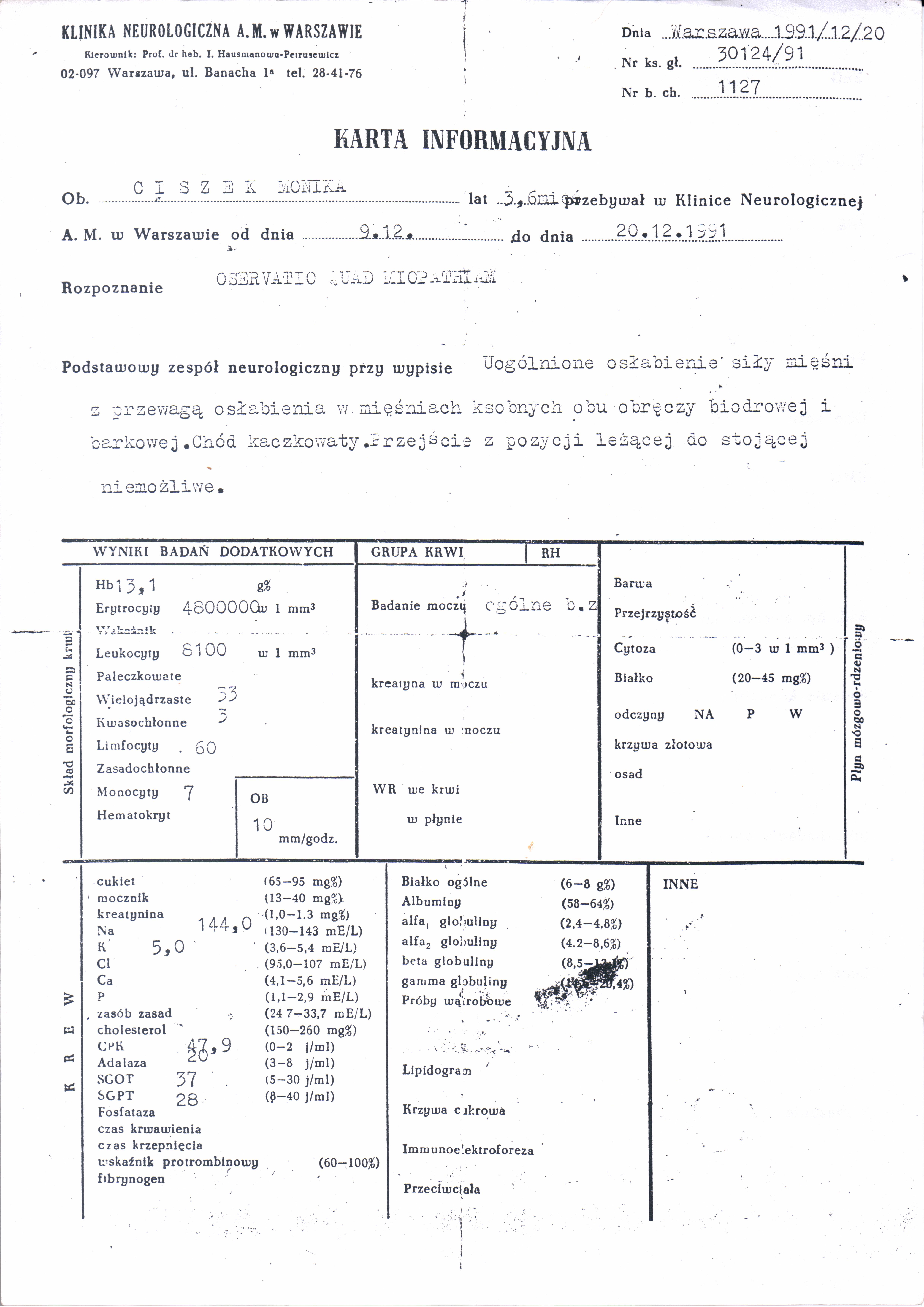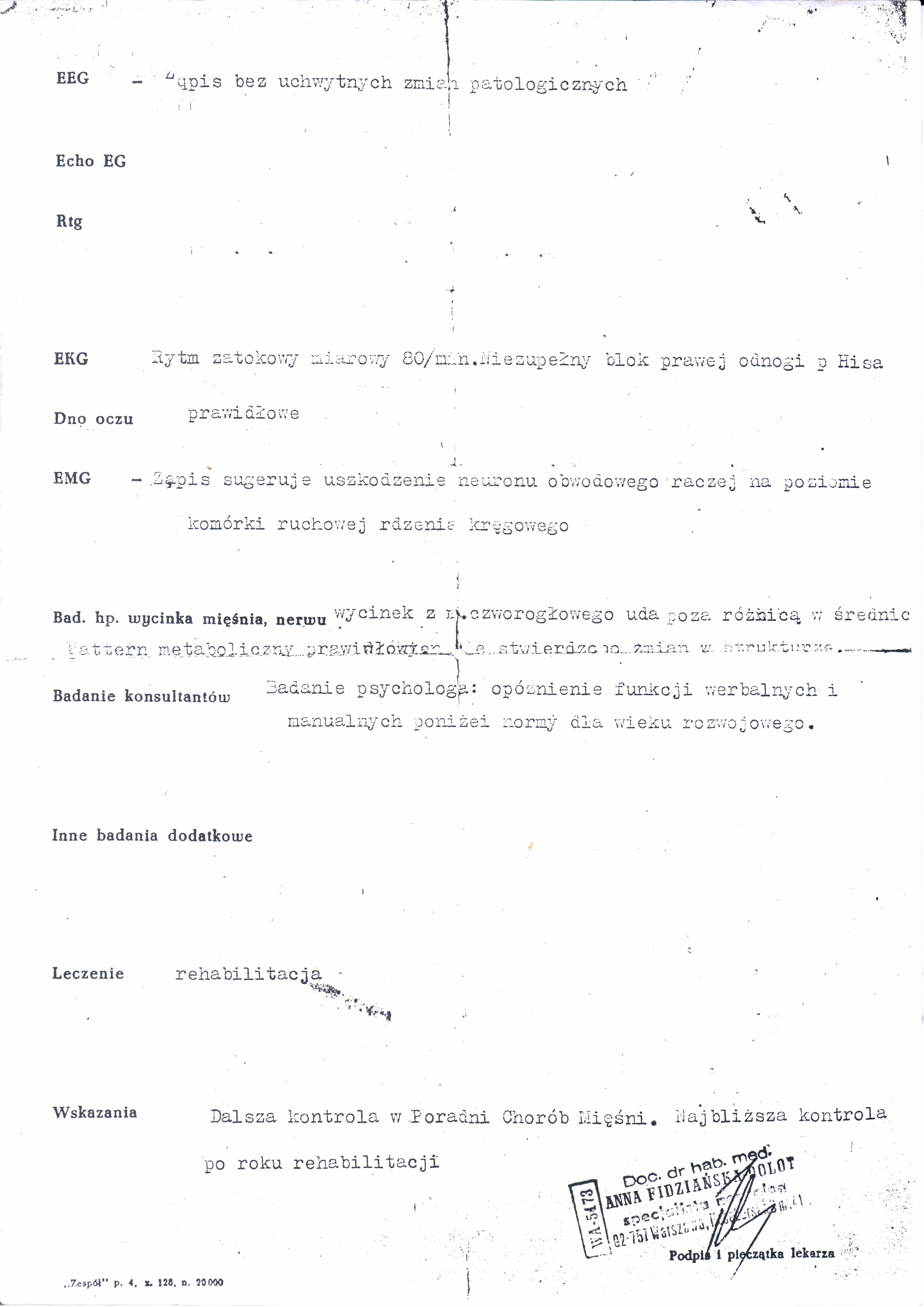 Dokumentacja Medyczna W tym dziale możecie Państwo zapoznać się z dokumentacją medyczną Moniki. Dokumentacja Medyczna » Klinika Neurologiczna A.M w Warszawie 20.12.1991r [Pokaz zdjęć]