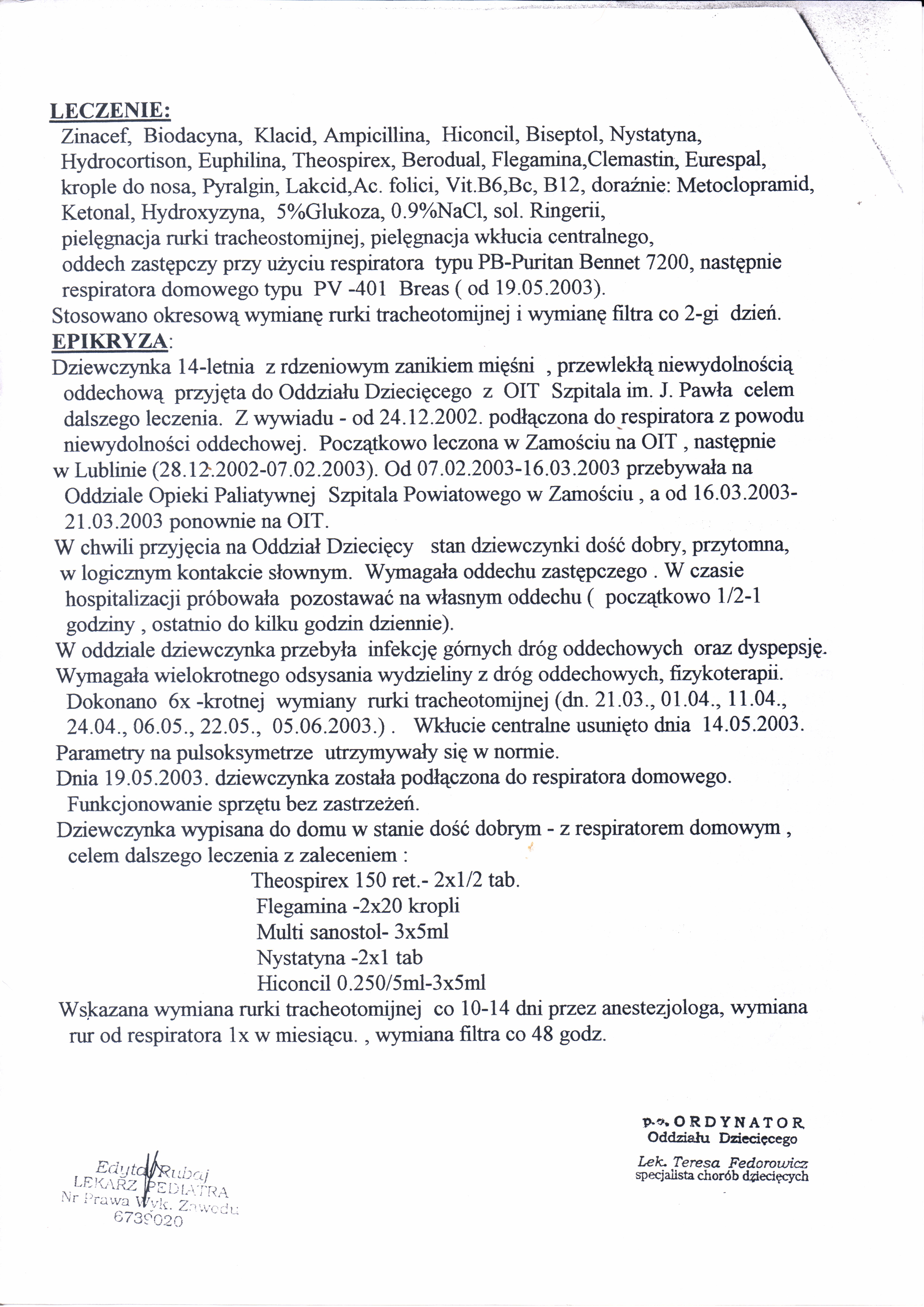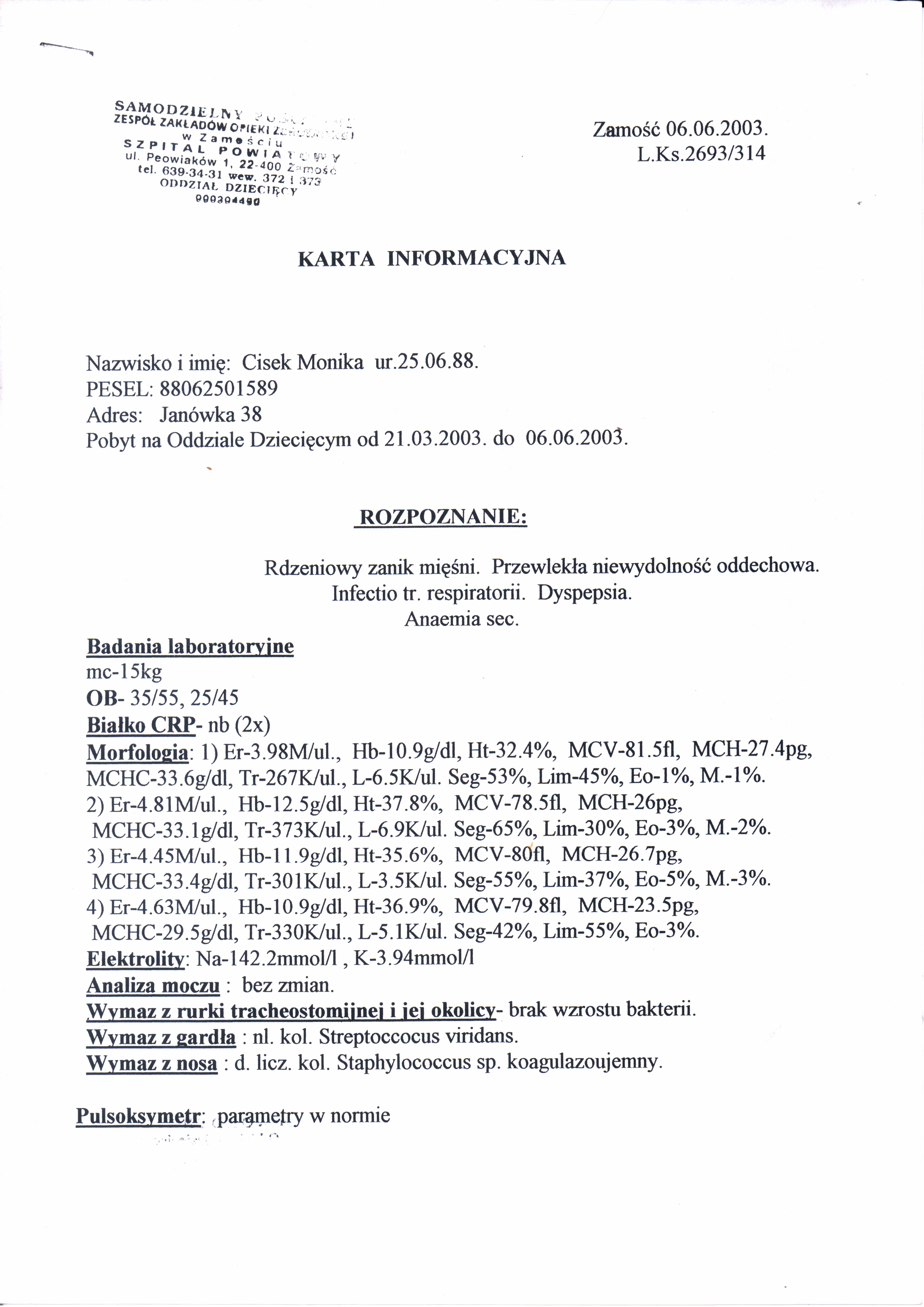 Dokumentacja Medyczna W tym dziale możecie Państwo zapoznać się z dokumentacją medyczną Moniki. Dokumentacja Medyczna » Zamojski Szpital Niepubliczny 21.03.2003 [Pokaz zdjęć]